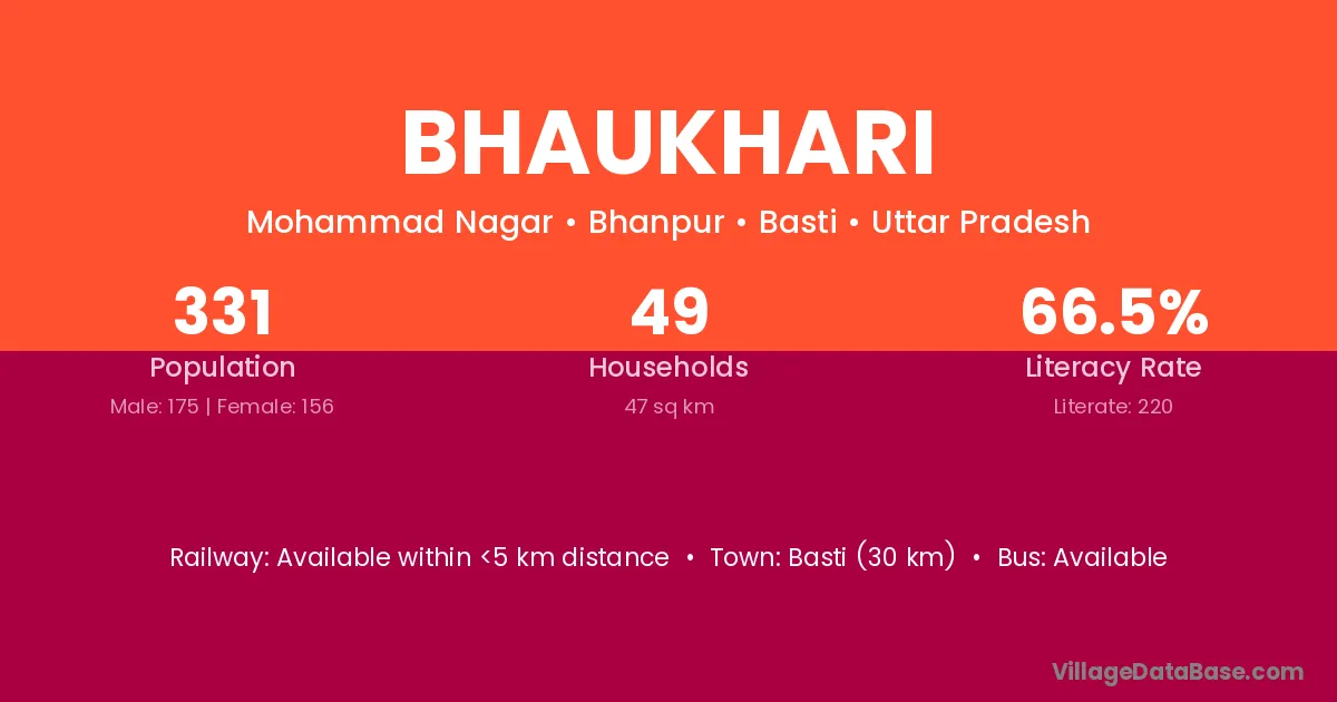 Basti (30 km) is the nearest town to Bhaukhari village for major economic activities and is located approximately 30 km away.