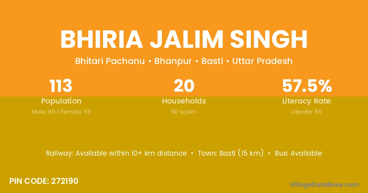 Basti (15 km) is the nearest town to Bhiria Jalim Singh village for major economic activities and is located approximately 15 km away.