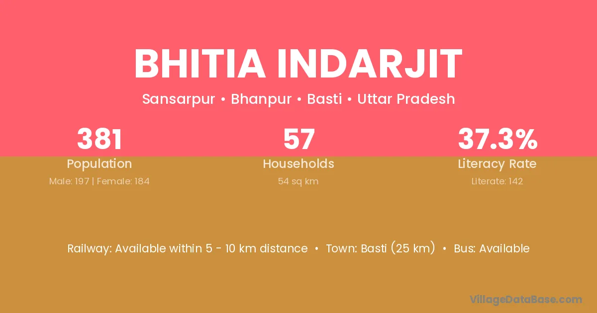 Basti (25 km) is the nearest town to Bhitia Indarjit village for major economic activities and is located approximately 25 km away.