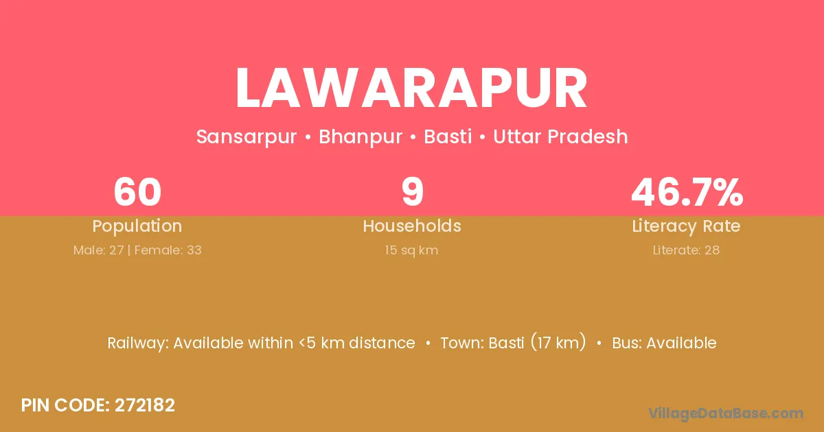 Basti (17 km) is the nearest town to Lawarapur village for major economic activities and is located approximately 17 km away.