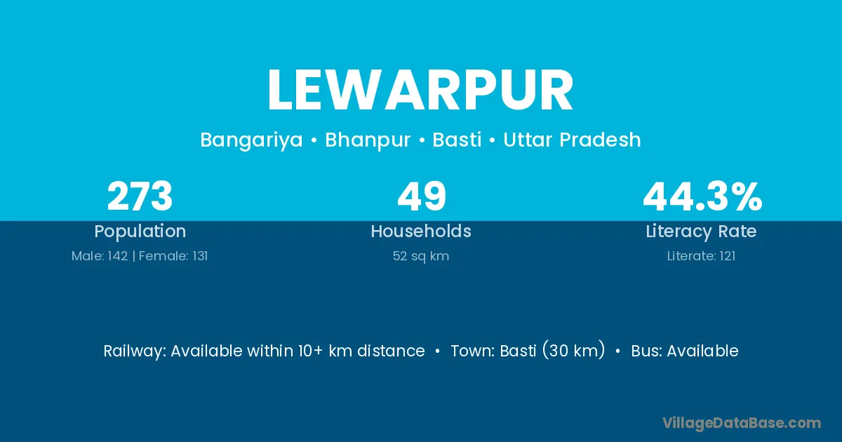 Basti (30 km) is the nearest town to Lewarpur village for major economic activities and is located approximately 30 km away.
