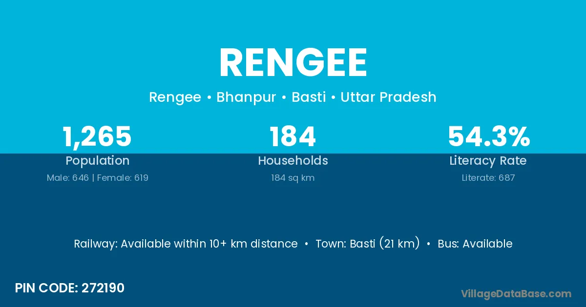 Basti (21 km) is the nearest town to Rengee village for major economic activities and is located approximately 21 km away.