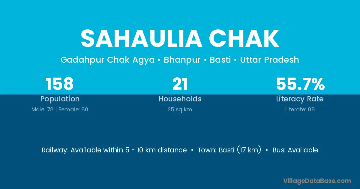 Basti (17 km) is the nearest town to Sahaulia Chak village for major economic activities and is located approximately 17 km away.