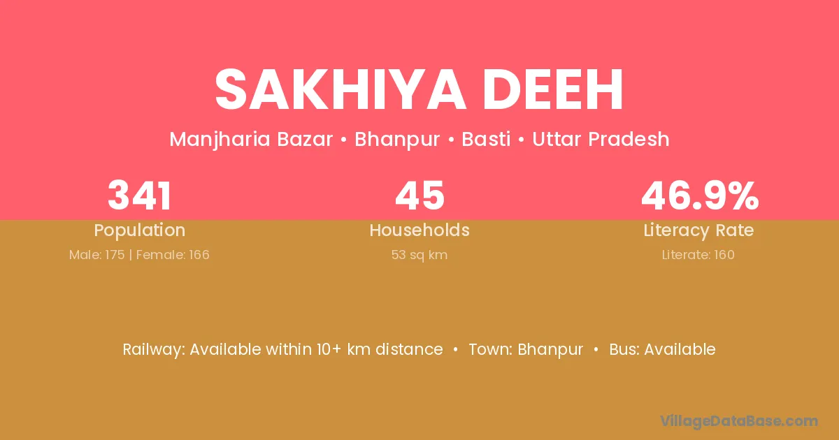 Sakhiya Deeh village has a total population of 341 people, of which 175 are males and 166 are females.