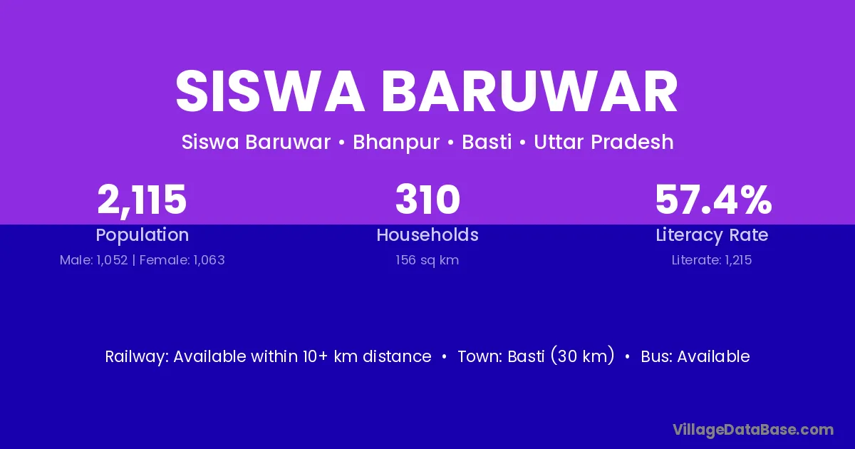 Basti (30 km) is the nearest town to Siswa Baruwar village for major economic activities and is located approximately 30 km away.