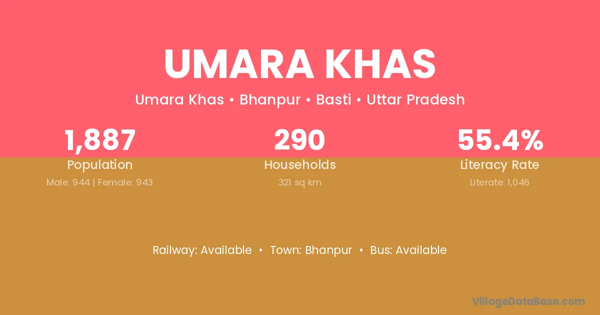 Umara Khas village has a total population of 1,887 people, of which 944 are males and 943 are females.