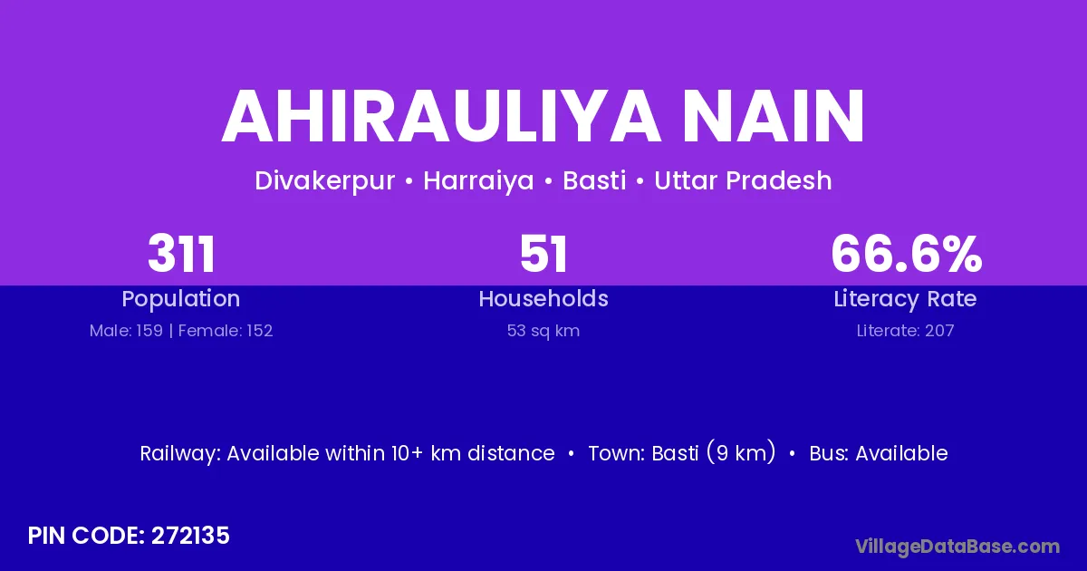 Basti (9 km) is the nearest town to Ahirauliya Nain village for major economic activities and is located approximately 9 km away.