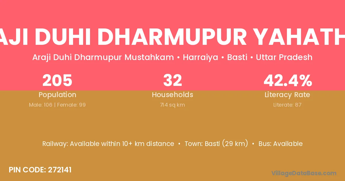 Araji Duhi Dharmupur Yahathali village has a total population of 205 people, of which 106 are males and 99 are females.
