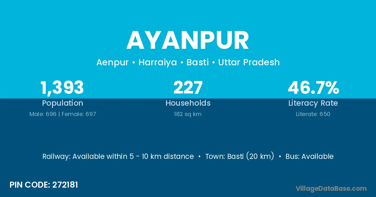 Basti (20 km) is the nearest town to Ayanpur village for major economic activities and is located approximately 20 km away.