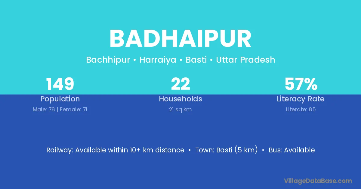 Basti (5 km) is the nearest town to Badhaipur village for major economic activities and is located approximately 5 km away.