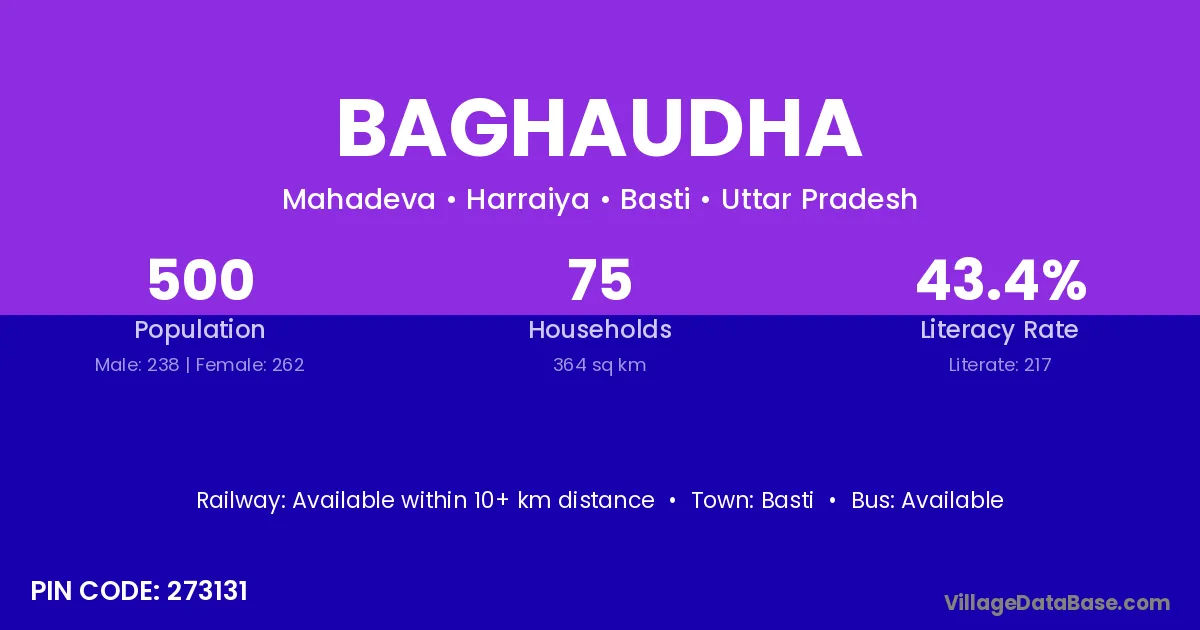 Baghaudha village has a total population of 500 people, of which 238 are males and 262 are females.