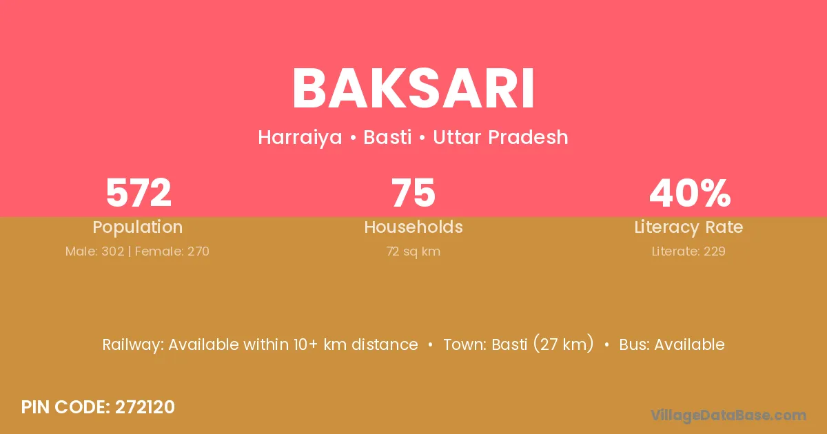 Basti (27 km) is the nearest town to Baksari village for major economic activities and is located approximately 27 km away.