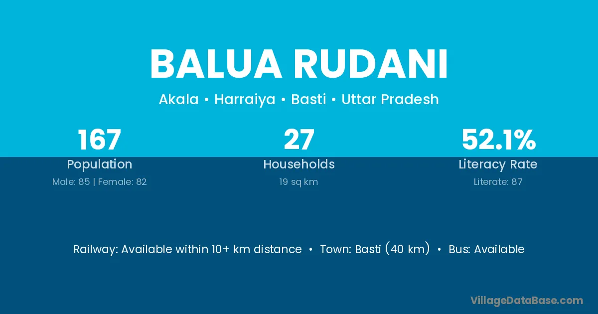 Basti (40 km) is the nearest town to Balua Rudani village for major economic activities and is located approximately 40 km away.