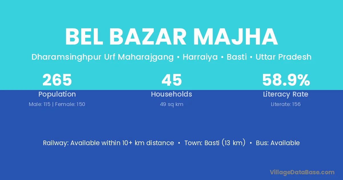 Basti (13 km) is the nearest town to Bel Bazar Majha village for major economic activities and is located approximately 13 km away.
