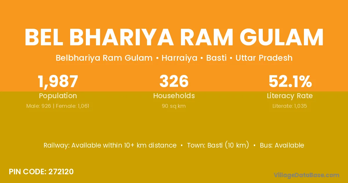 Basti (10 km) is the nearest town to Bel Bhariya Ram Gulam village for major economic activities and is located approximately 10 km away.