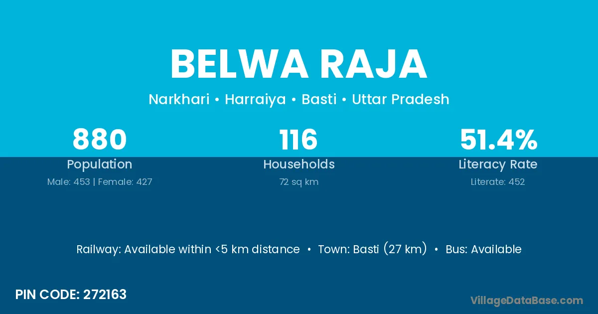 Basti (27 km) is the nearest town to Belwa Raja village for major economic activities and is located approximately 27 km away.