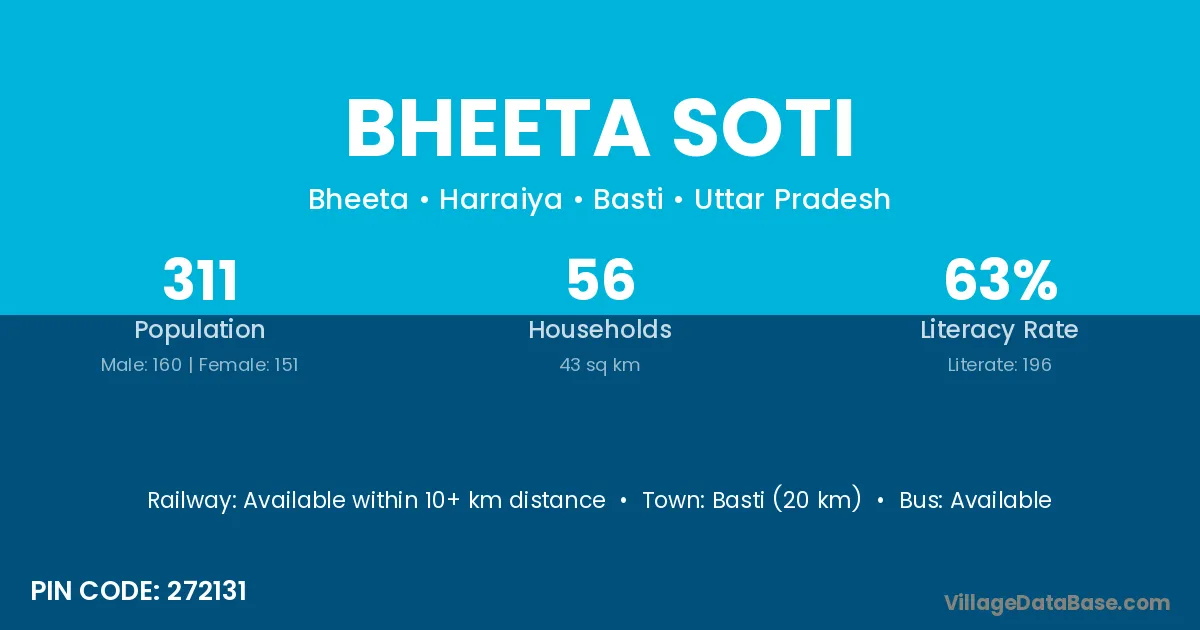 Basti (20 km) is the nearest town to Bheeta Soti village for major economic activities and is located approximately 20 km away.