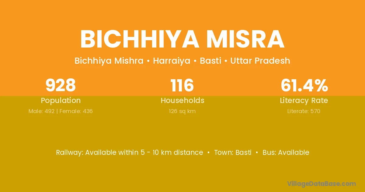 Bichhiya Misra village has a total population of 928 people, of which 492 are males and 436 are females.