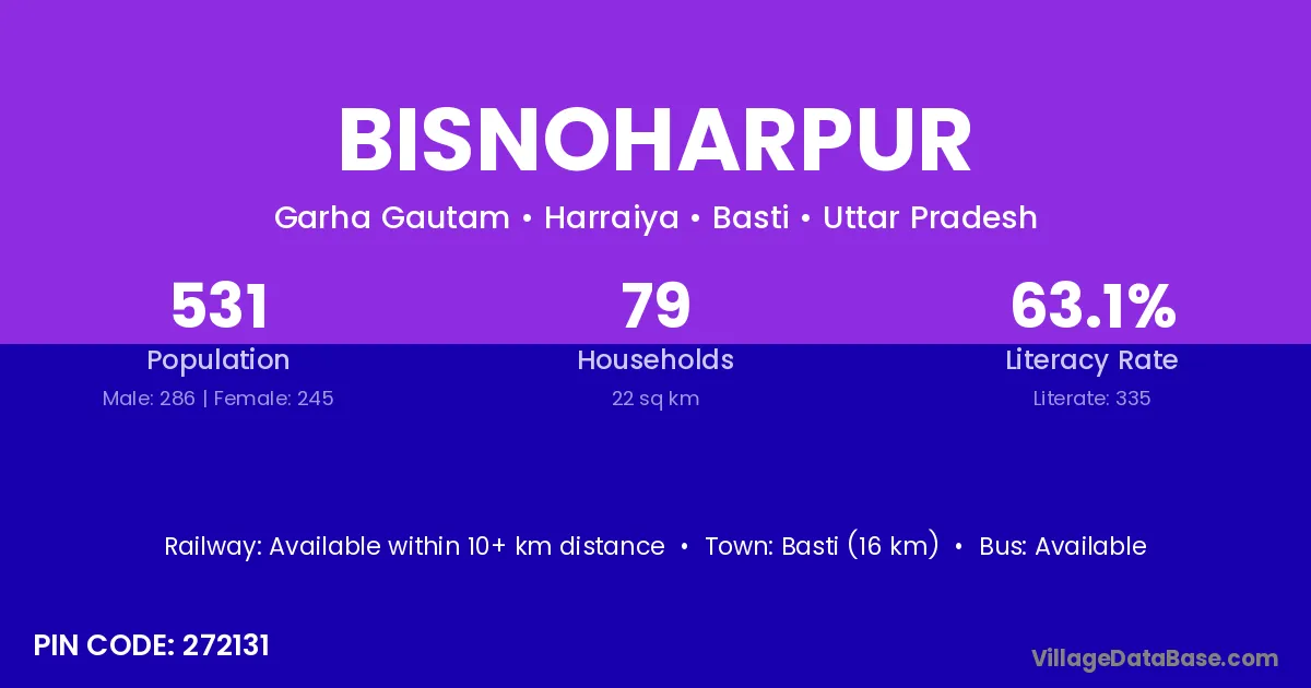 Basti (16 km) is the nearest town to Bisnoharpur village for major economic activities and is located approximately 16 km away.
