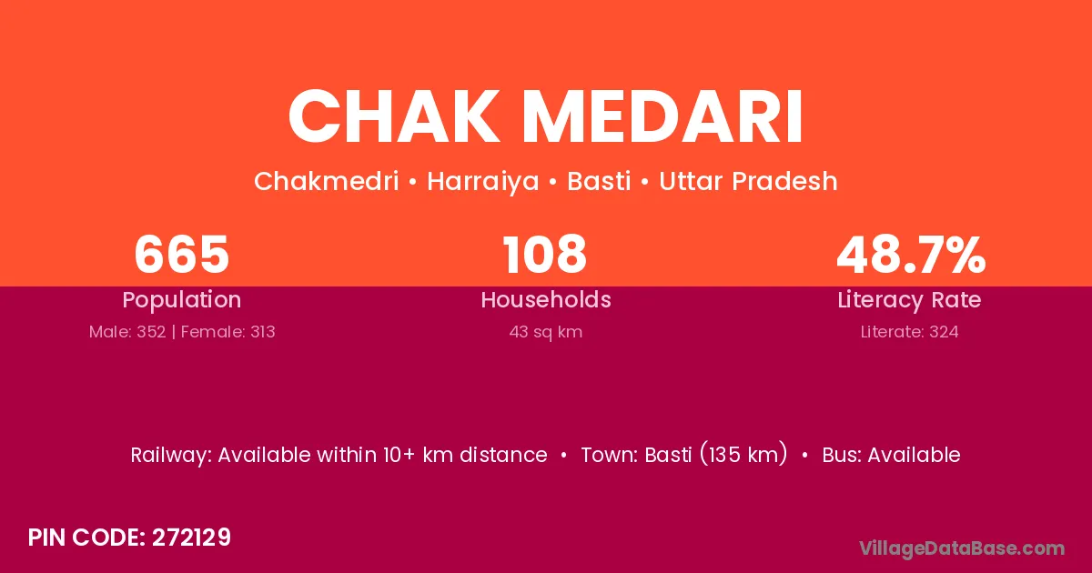 Basti (135 km) is the nearest town to Chak Medari village for major economic activities and is located approximately 135 km away.