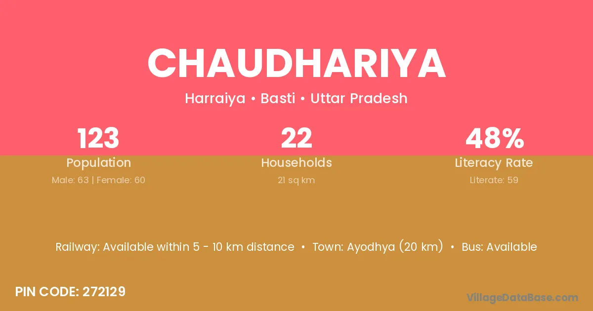 Ayodhya (20 km) is the nearest town to Chaudhariya village for major economic activities and is located approximately 20 km away.