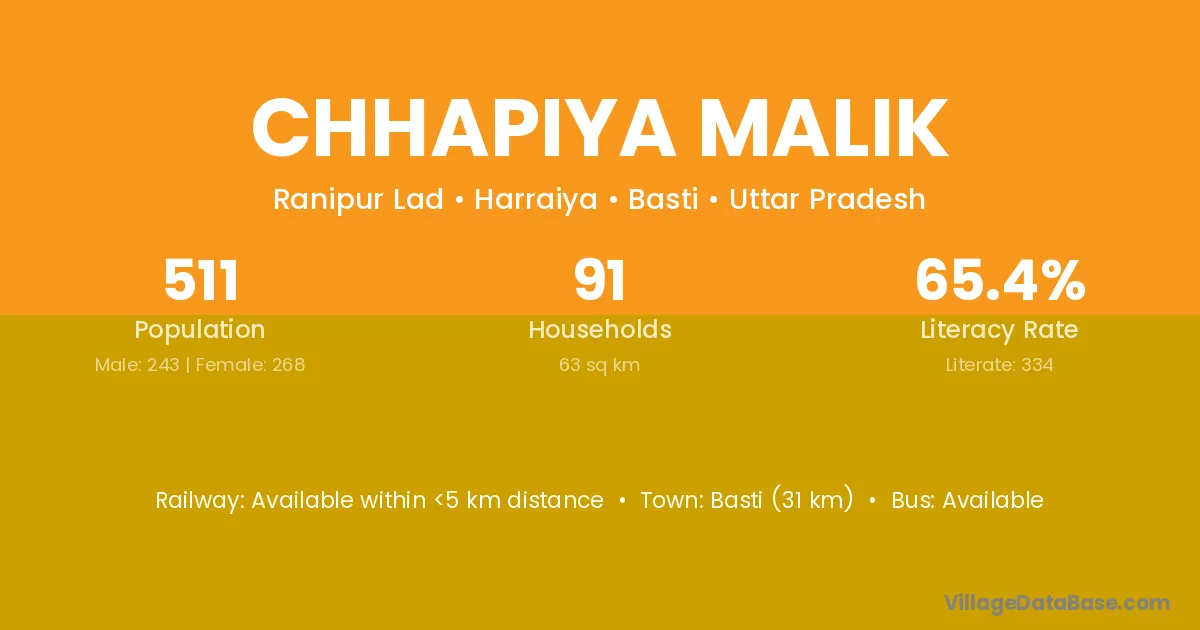 Basti (31 km) is the nearest town to Chhapiya Malik village for major economic activities and is located approximately 31 km away.