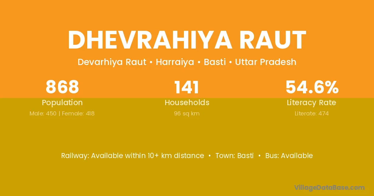 Dhevrahiya Raut village has a total population of 868 people, of which 450 are males and 418 are females.