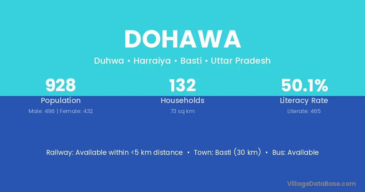 Basti (30 km) is the nearest town to Dohawa village for major economic activities and is located approximately 30 km away.