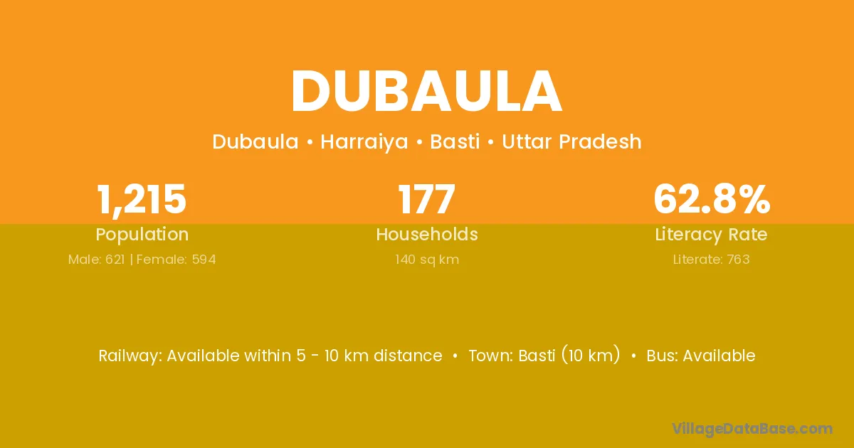 Basti (10 km) is the nearest town to Dubaula village for major economic activities and is located approximately 10 km away.