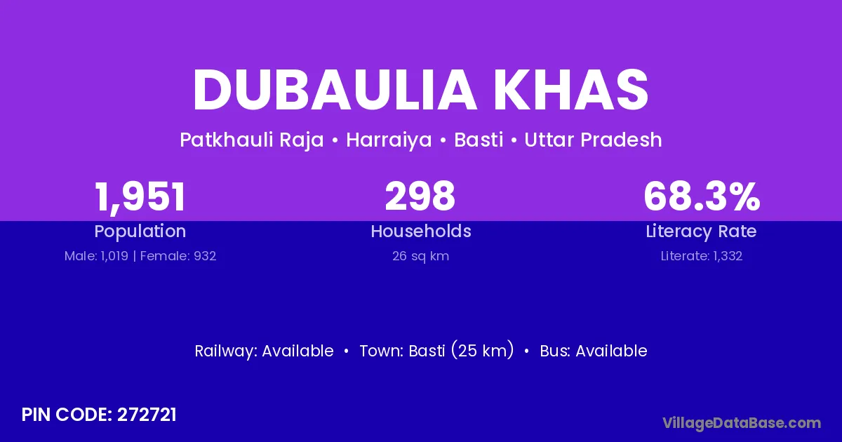 Basti (25 km) is the nearest town to Dubaulia Khas village for major economic activities and is located approximately 25 km away.