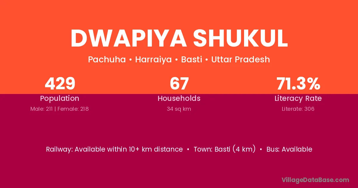 Dwapiya Shukul village has a total population of 429 people, of which 211 are males and 218 are females.