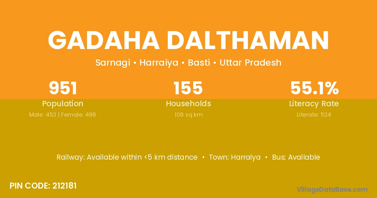Gadaha Dalthaman village has a total population of 951 people, of which 453 are males and 498 are females.