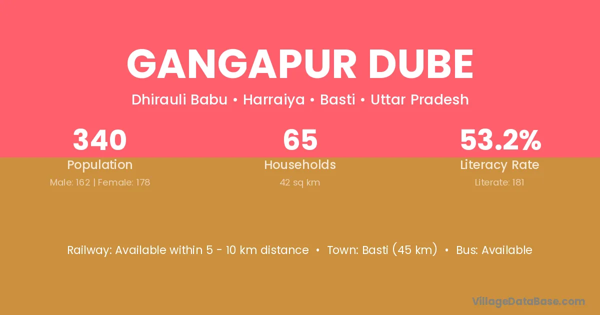 Basti (45 km) is the nearest town to Gangapur Dube village for major economic activities and is located approximately 45 km away.