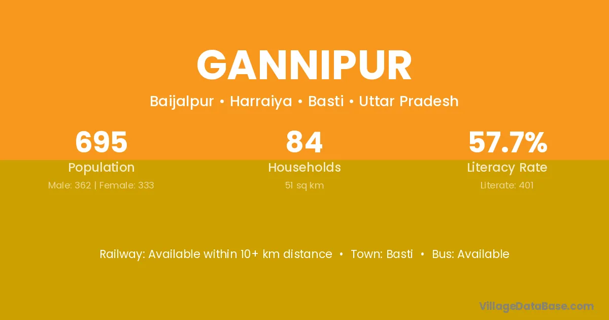 Gannipur village has a total population of 695 people, of which 362 are males and 333 are females.