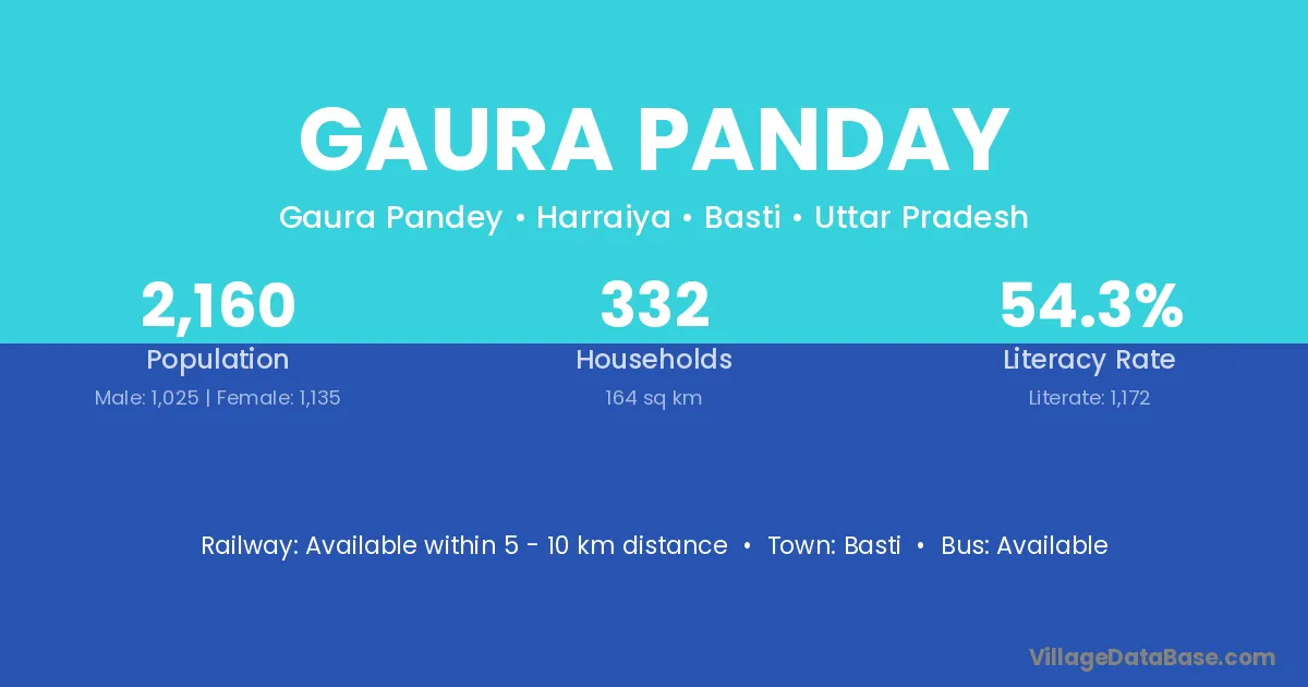 Gaura Panday village has a total population of 2,160 people, of which 1,025 are males and 1,135 are females.