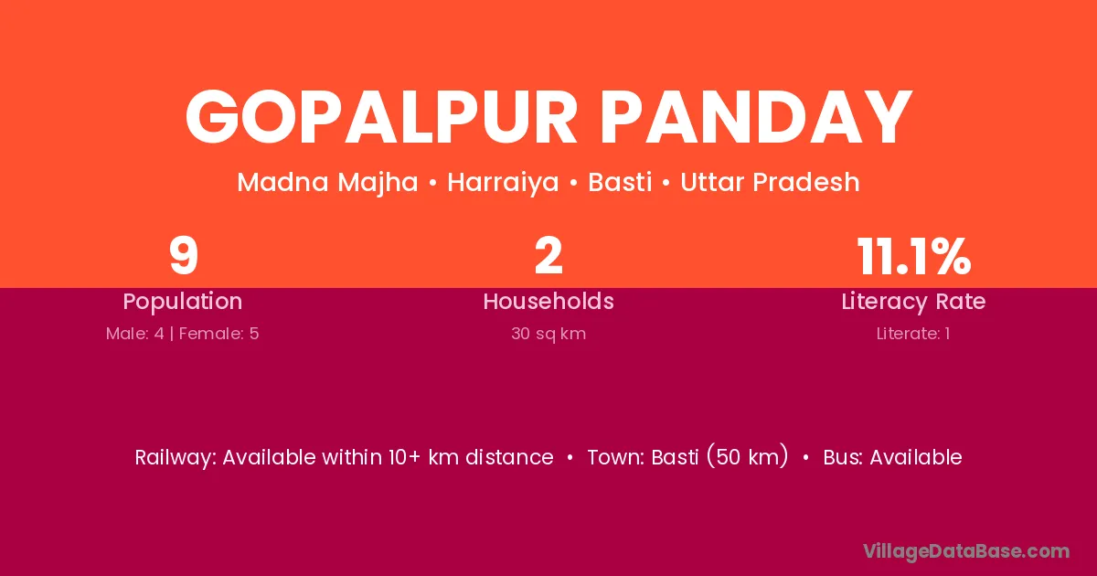 Gopalpur Panday village has a total population of 9 people, of which 4 are males and 5 are females.
