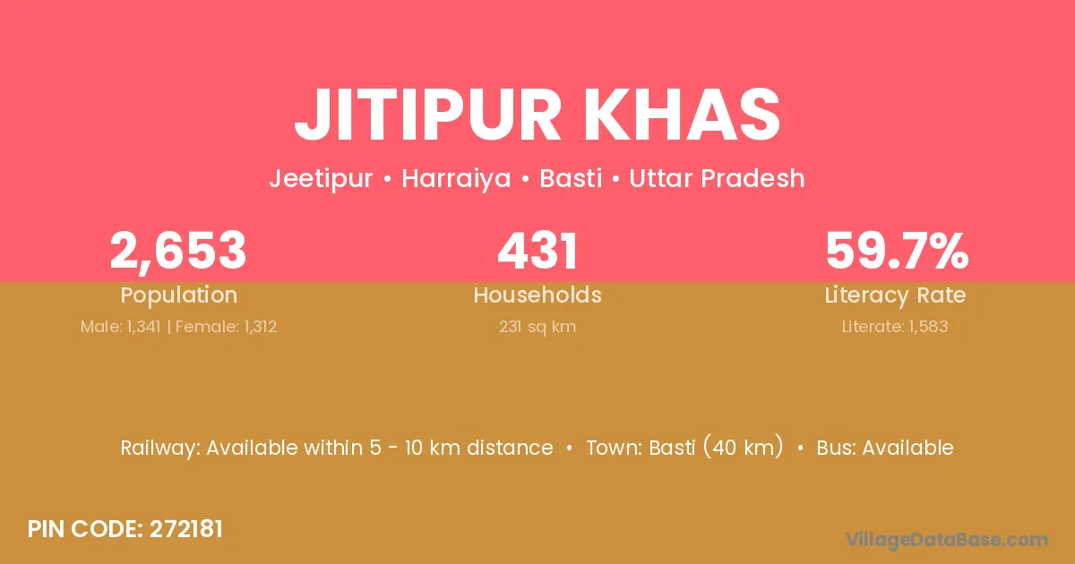 Jitipur Khas village has a total population of 2,653 people, of which 1,341 are males and 1,312 are females.
