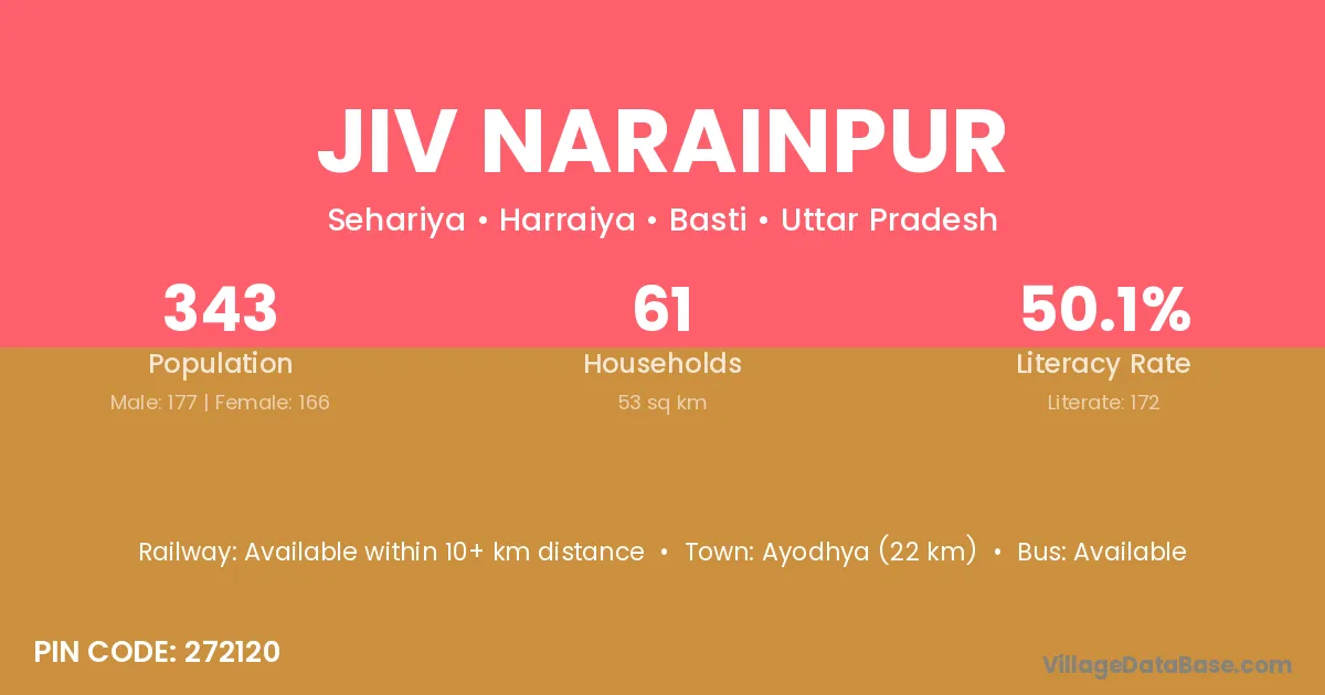 Ayodhya (22 km) is the nearest town to Jiv Narainpur village for major economic activities and is located approximately 22 km away.
