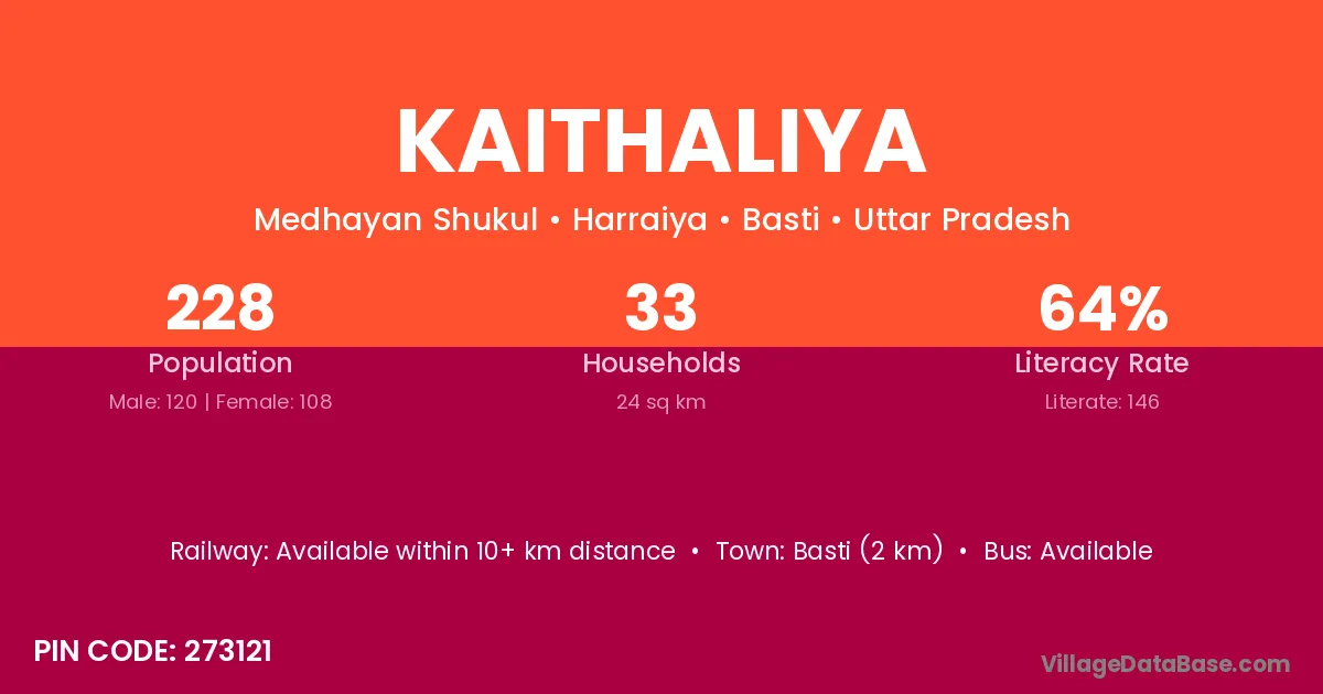 Basti (2 km) is the nearest town to Kaithaliya village for major economic activities and is located approximately 2 km away.