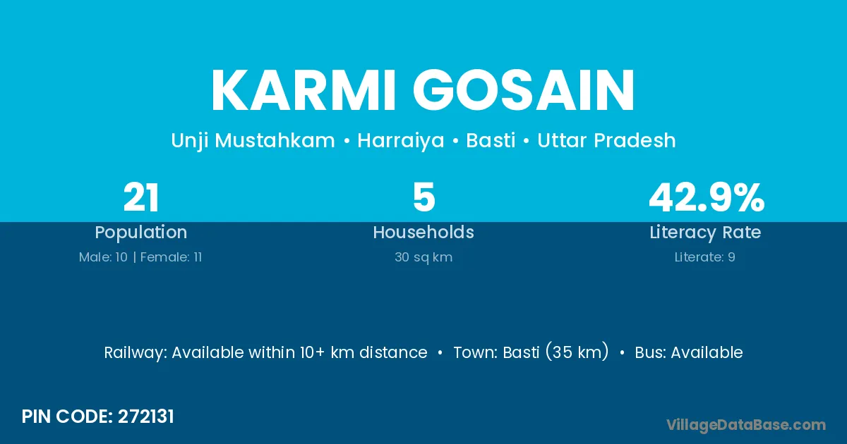 Basti (35 km) is the nearest town to Karmi Gosain village for major economic activities and is located approximately 35 km away.
