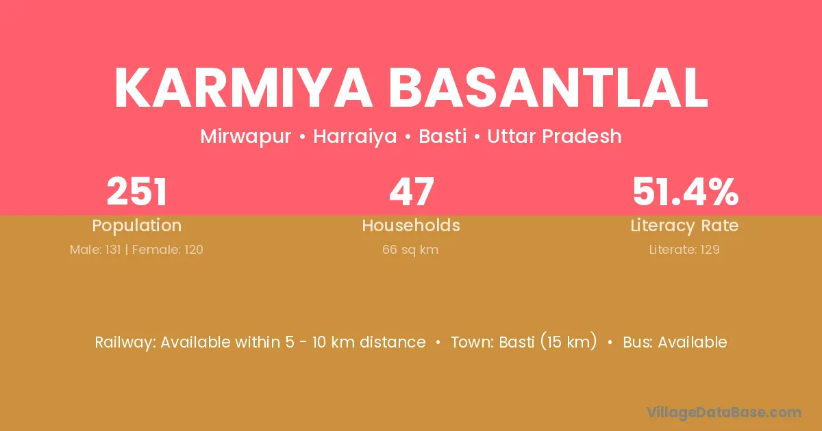 Basti (15 km) is the nearest town to Karmiya Basantlal village for major economic activities and is located approximately 15 km away.