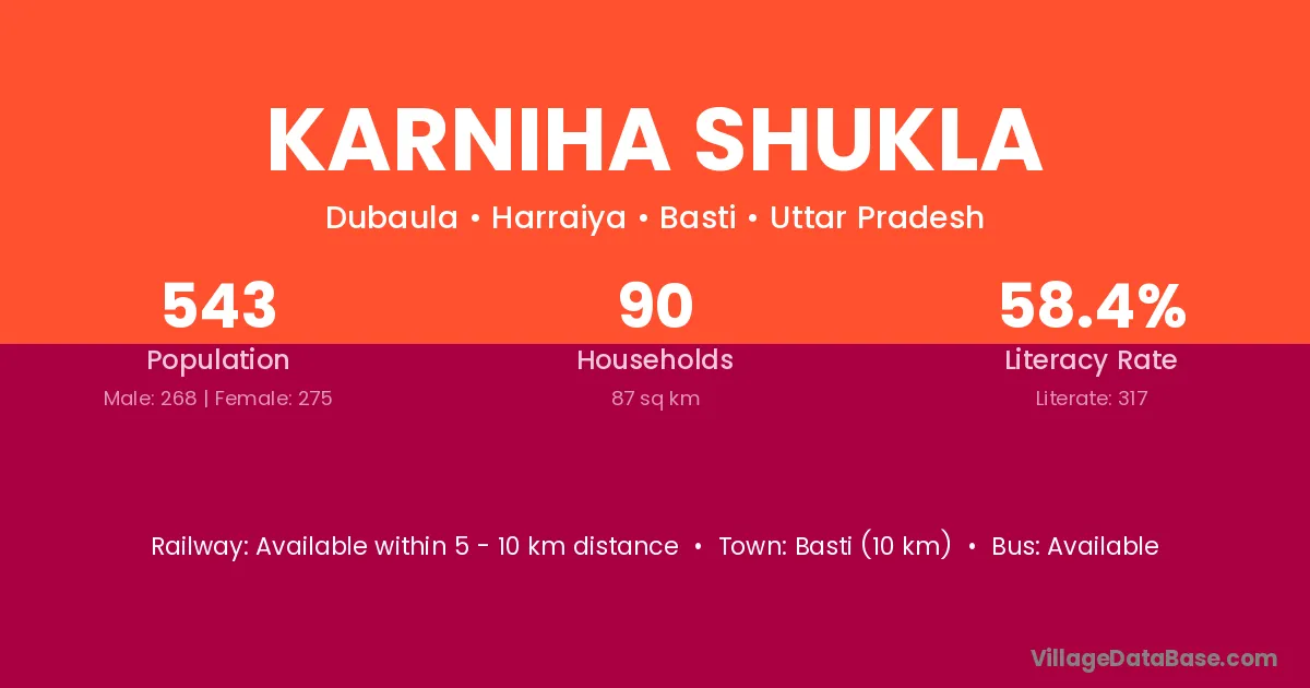 Basti (10 km) is the nearest town to Karniha Shukla village for major economic activities and is located approximately 10 km away.
