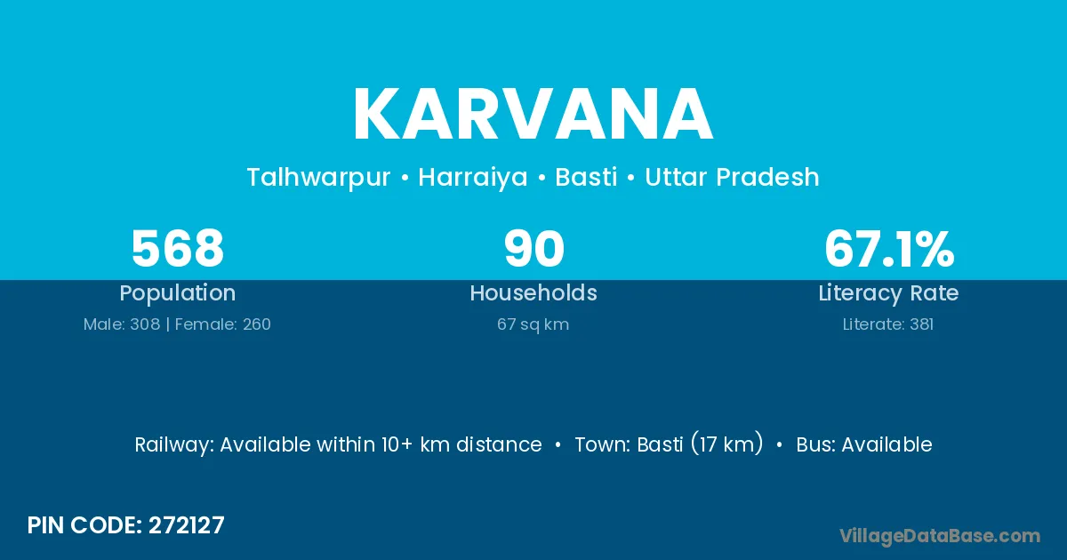 Basti (17 km) is the nearest town to Karvana village for major economic activities and is located approximately 17 km away.