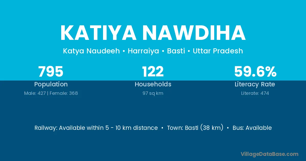 Basti (38 km) is the nearest town to Katiya Nawdiha village for major economic activities and is located approximately 38 km away.