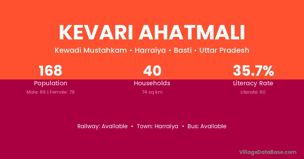 Kevari Ahatmali village has a total population of 168 people, of which 89 are males and 79 are females.