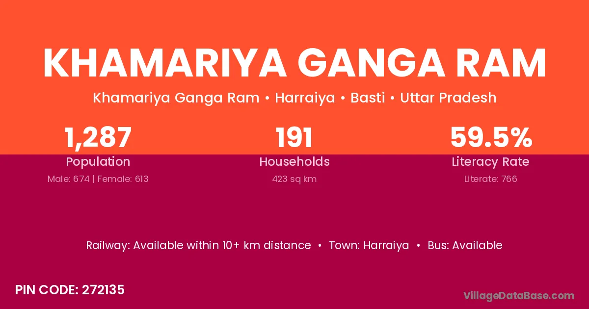 Khamariya Ganga Ram village has a total population of 1,287 people, of which 674 are males and 613 are females.