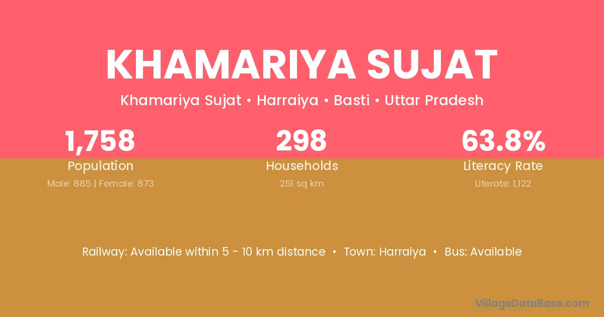 Khamariya Sujat village has a total population of 1,758 people, of which 885 are males and 873 are females.