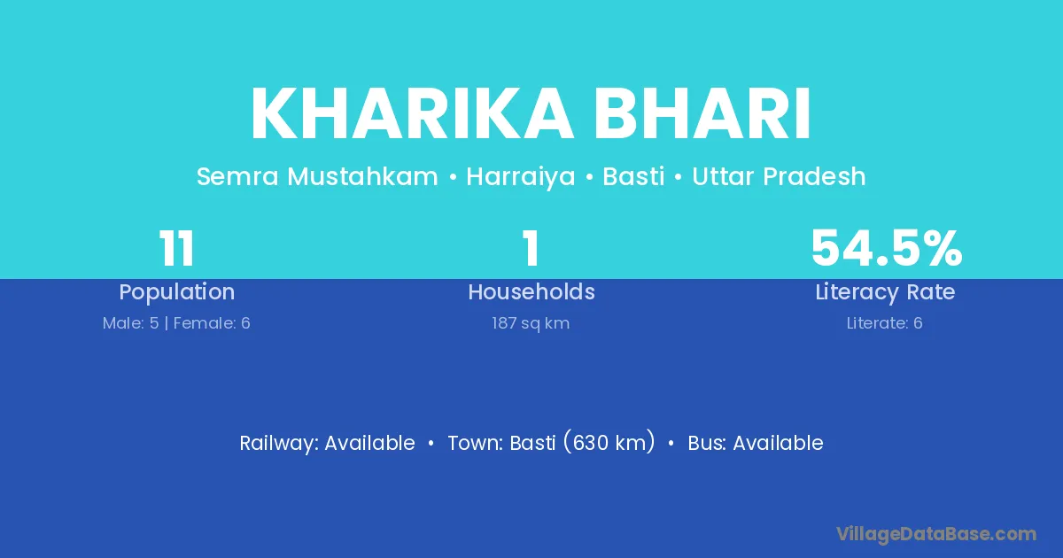 Basti (630 km) is the nearest town to Kharika Bhari village for major economic activities and is located approximately 630 km away.