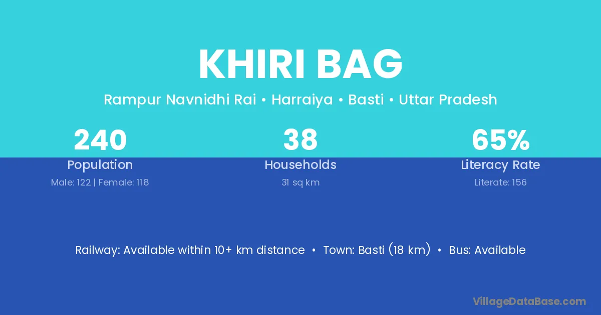 Basti (18 km) is the nearest town to Khiri Bag village for major economic activities and is located approximately 18 km away.