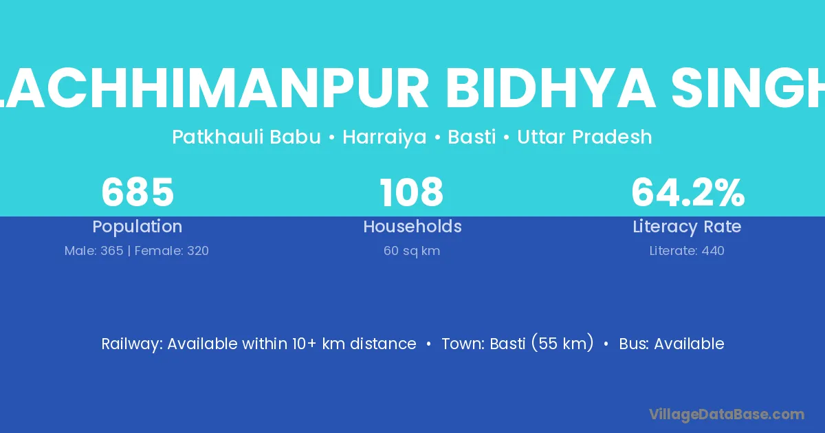 Basti (55 km) is the nearest town to Lachhimanpur Bidhya Singh village for major economic activities and is located approximately 55 km away.
